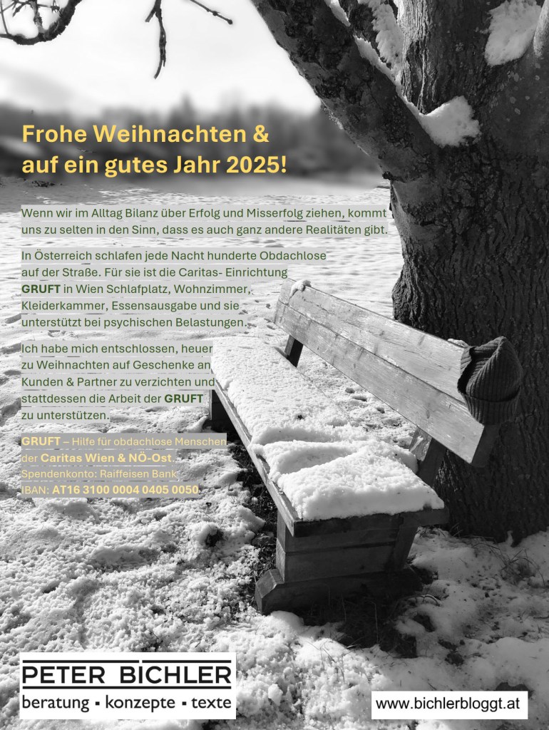 Wenn wir im Alltag Bilanz über Erfolg und Misserfolg ziehen, kommt uns zu selten in den Sinn, dass es auch ganz andere Realitäten gibt. Ich habe mich dazu entschlossen, heuer zu Weihnachten auf Geschenke an Kunden & Partner zu verzichten und stattdessen die Arbeit der GRUFT, eine der bekanntesten Einrichtungen für Obdachlosenhilfe in Österreich, zu unterstützen.